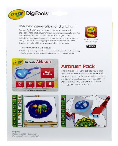 -. Binding : Toy -. Brand : Crayola -. Color : red -. Department : Electronics, arts and crafts -. EAN : 1330010659202 -. Feature : Includes A Unique Digital Stylus; Digital Stamper; Special Tool; Free Crayola Effects Application and Custom Carrying Case / Create with Airbrush tool that lays down Airbrush effects / Create with Squeegee tool that spreads mixed colors on the screen / Use the in-app stencils; Digital Stamper and Digital Rainbow Roller to bring your child's creations to life / 25 Line Art Shapes and Backgrounds; 25 Airbrush Stamps and 20 Stencils -. IsAdultProduct : 0 -. IsAutographed : 0 -. IsMemorabilia : 0 -. Label : Binney & Smith -. Manufacturer : Binney & Smith -. Model : 95-1013 -. MPN : 95-1013 -. PackageQuantity : 1 -. PartNumber : 95-1013 -. ProductGroup : Toy -. ProductTypeName : TOYS_AND_GAMES -. Publisher : Binney & Smith -. Studio : Binney & Smith -. Title : Crayola DigiTools Airbrush Pack -. UPC : 063652347800 -. Warranty : No Warranty