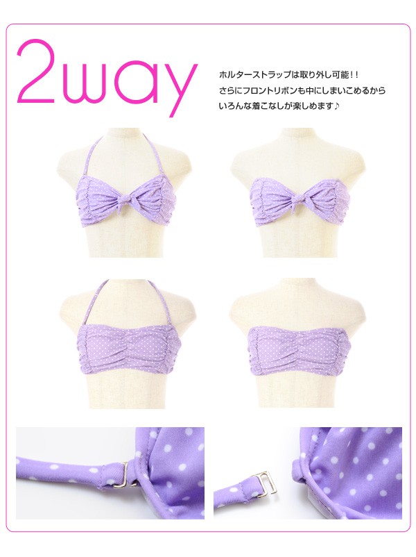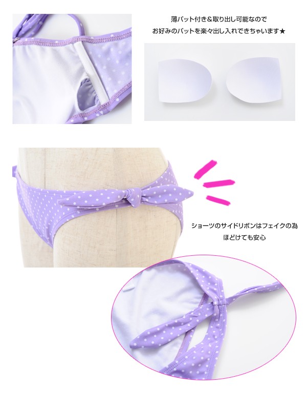 cuteなドット柄とリボンがコラボした 女の子らしいビキニ♪ ブラのFRONTとパンツのSIDEについた リボンが可愛らしさたっぷり★ ホルタ―ネックのストラップは 取り外しOKなので、人気のバンドゥにも早変わり◎ ホック付きのシリコンブラを使用する際、 FRONTリボンと一緒に結べば 目立ちにくく、機能性もバツグンです♪ ※輸送上の都合により、多少の汚れ・シミなどが見られる場合がございます。 また、発送上の状態によって商品がシワになる場合がございます。予めご了承くださいませ。 |