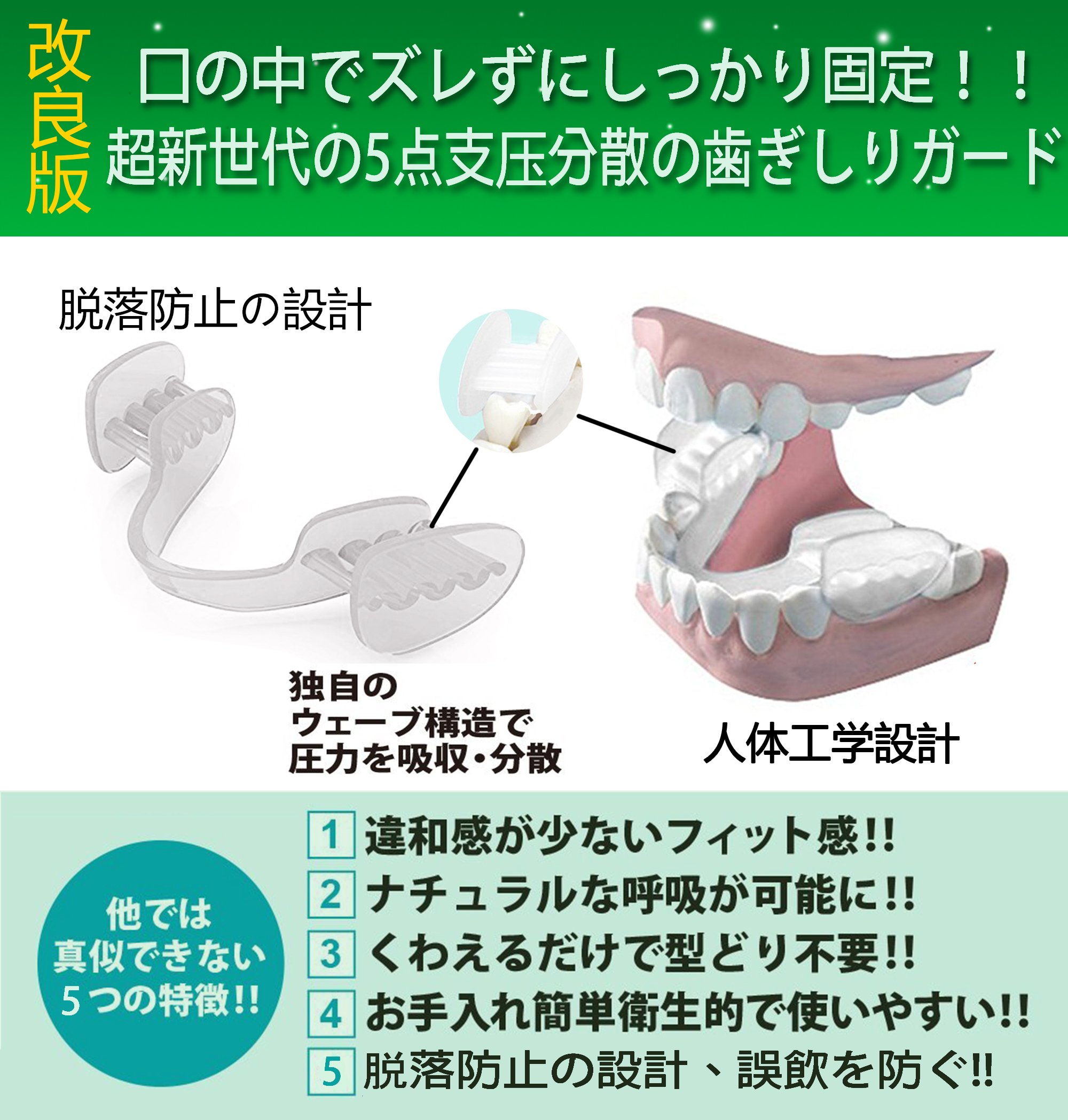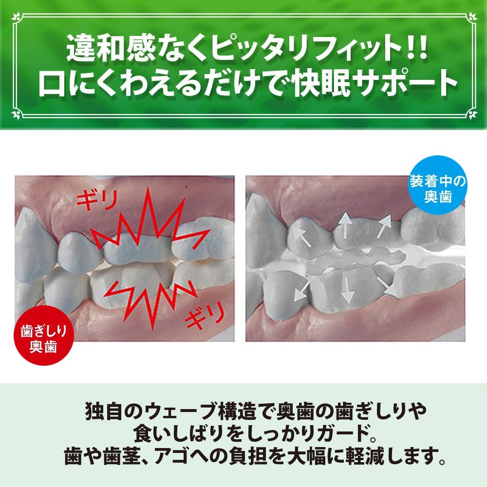 Even though the mouthpiece is unconscious of bruxism and clenching, the special wave form made of silicone disperses and absorbs the occlusal pressure, making it an exquisite spring structure that does not make contact between upper and lower back teeth.