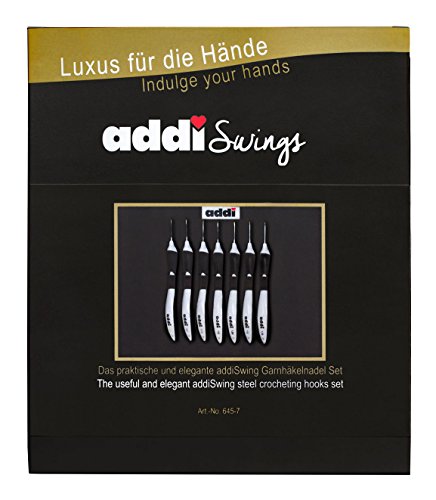 addi Swing Fine hook set comes with approximate US sizes 18, 16, 14, 12, 10, 8 & 6 (.5mm-1.75mm) in a portable snap-closed, addi case.