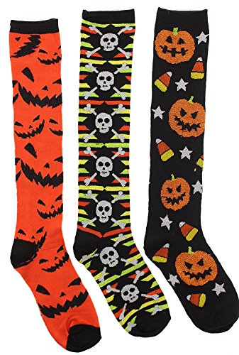 Binding : Apparel Product Description Boo! women's Halloween knee highs socks in a three pair value pack. These socks are the perfect no calorie treat for Halloween. They make great gifts for teachers, daughters, friends, family and neighbors. All the most popular Halloween themes are here: Ghosts, bats, skulls, mummies, zombies, candy corn, blood splatter, spiders and more. Socks are 85% acrylic, 10% nylon and 5% spandex for comfort. Socks are a one size fits most 9-11. 0