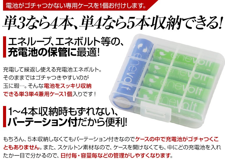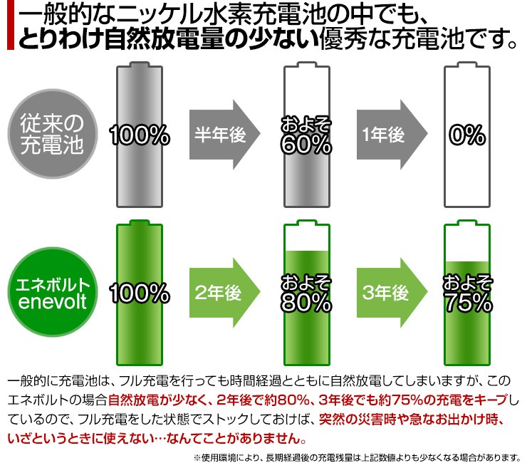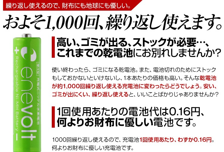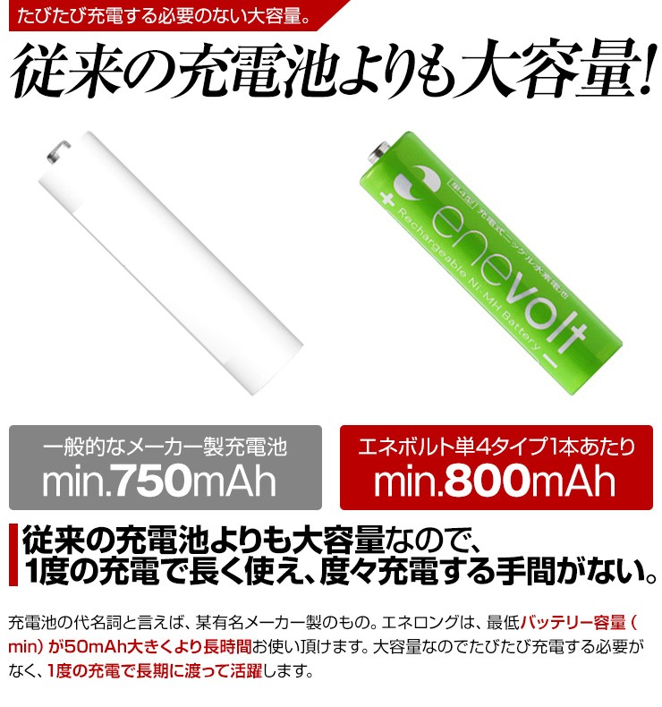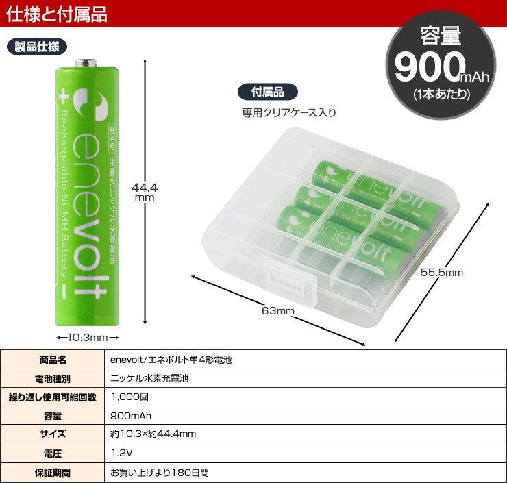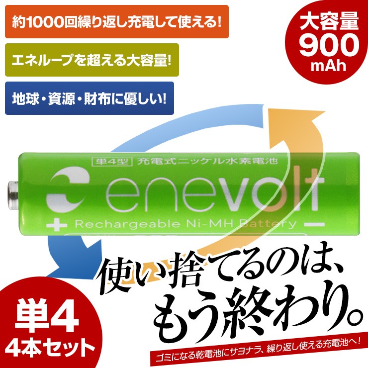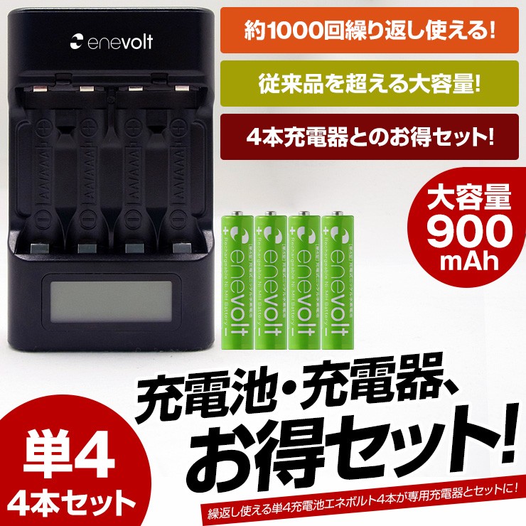 充電池 エネボルト enevolt エネループ eneloop 経済的 エコ ニッケル水素充電池 乾電池 900mAh 単3 4本セット 充電池用充電器 1000回使える 保証 レビュー記載で送料無料大人気商品、充電池エネボルト(単4)4本と専用充電器(4本充電用)がお得なセットに! 【エネボルト特徴】●強さ長持ち大容量●1000回繰り返し充電して使えるので、お財布にも地球にも優しい。●自然放電量が少なく、フル充電から3年を経過しても、75%の容量が残っています。●メモリー効果が少なく、継ぎ足し充電に強い。●180日保証だから安心。●充電は、当社enevolt対応の充電器を使用して下さい。●外装ラベルを剥がしたり、傷をつけない。●新旧の電池や充電した電池と放電した電池の混用をしない。●強い衝撃を与えたり、投げつけない。【充電器特徴】●単3・単4サイズの充電池を同時に4個まで充電できる!(1本だけでも充電でき、単3と単4がまざってもOK)●ACアダプタ/車のシガーソケットから給電できる!●充電状況がわかるディスプレイ付き!(アニメーションが終わり、満タン表示になったら充電完了)デジキン