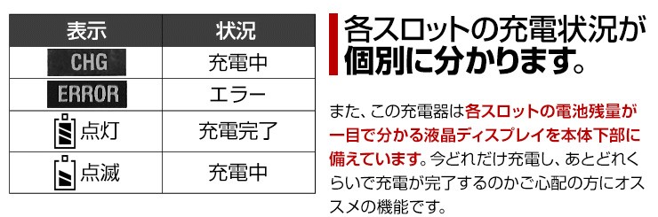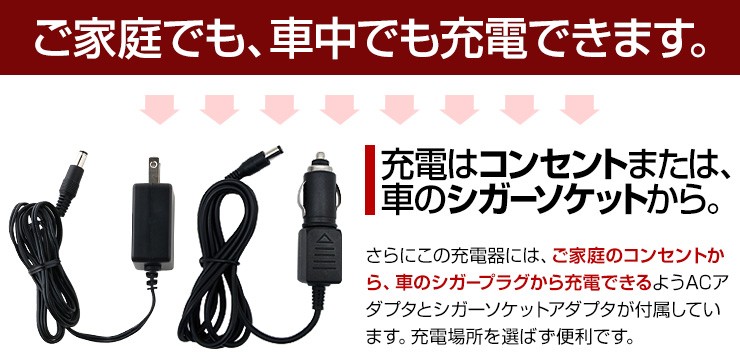| 付属品 | 充電器本体、ACアダプタ、シガーソケットアダプタ、日本語説明書 |
