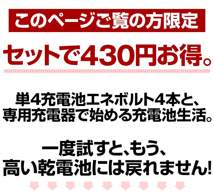 単4充電池4本と4本充電器が430円お得にお買い求め頂けます。