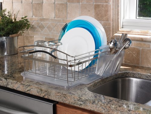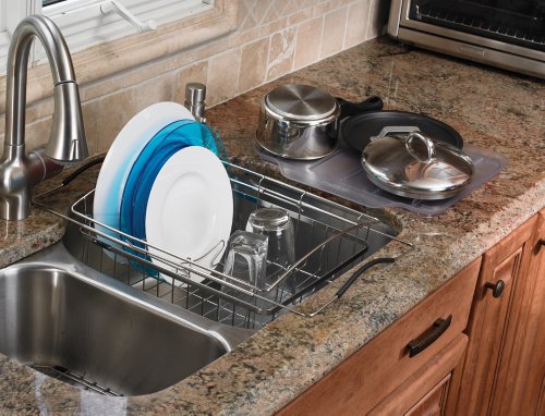 - Feature : Elegant design made from rust-resistant brushed stainless steel / Expands to your needs; arms extend to 24-1/2-inch for in-sink use / Wire plate and cup holders can be used on drain tray or over sink for increased drying space / Frosted drain tray and cutlery holder with split compartments / Dishwasher safe on top rack only