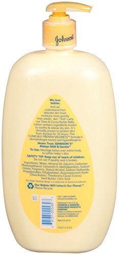 -. Binding : Health and Beauty -. Brand : Johnson's -. EAN : 0763529125592 -. Feature : Johnsons with Shea and Cocoa Butter Baby Lotion relieve dry skin with hydrating emollients to maintain skin's natural moisture for 24 hours. / It is non greasy and fast absorbing. / Johnson's Baby Lotion with Shea & Cocoa Butter is allergy-tested, and clinically proven mild, so it can be used on all skin types. Use everyday for baby soft skin. / This creamy lotion nourishes and conditions baby's skin leaving it feeling soft and smooth. -. IsAdultProduct : 0 -. Label : Johnson's -. Manufacturer : Johnson's -. Model : JJ-2337 -. MPN : JJ-2337 -. PackageQuantity : 1 -. PartNumber : JJ-2337 -. ProductGroup : Grocery -. ProductTypeName : HEALTH_PERSONAL_CARE -. Publisher : Johnson's -. Size : 27 OZ -. SKU : K992610 -. Studio : Johnson's -. Title : Johnson's Baby Lotion, Cocoa and Shea Butter, 27 Ounce -. UPC : 763529125592