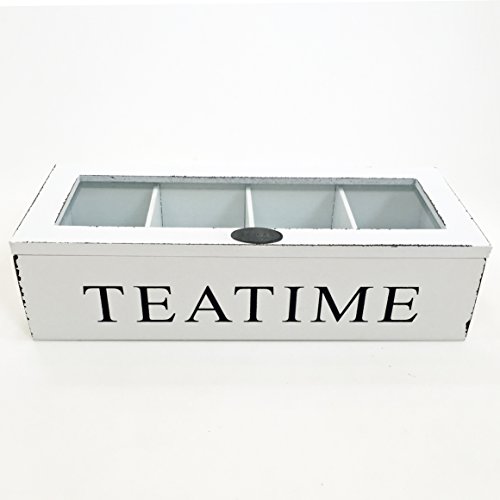 -. Feature : Design: hinged lid with glass window, 4 compartments for tea, each measure 3 3/4 long, 2 1/2 wide, 2 1/4 deep to hold a sizeable collection of tea bags / Distressed white paint over wood Chest look-a-like MDF box with glass cover, measures 10 5/8 x 4 3/8 x 2 ¾" / The Perfect gift for tea lovers: Ideal for birthday gifts, anniversaries, showers, house and wedding gifts.