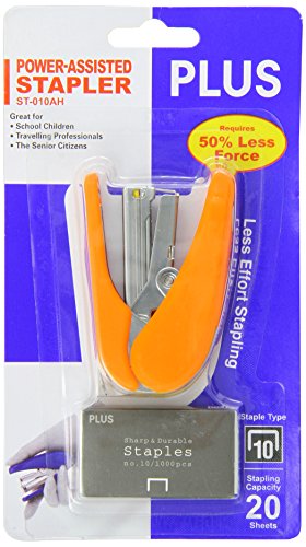 Product Description The Plus Power Assist Stapler requires 50% less force and can easily be used to staple up to 20 sheets of paper with just one hand. 0