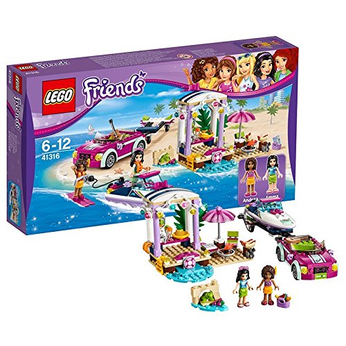 -. Feature : Enthält die Spielfiguren Andrea und Emma sowie die Schildkröte Bubbles als zusätzliche Figur. / Enthält ein Rennboot mit Steuer und drehendem Propeller, ein Strandauto mit Anhänger und ein Partygelände mit Saftbar, Mixer, zwei Sonnenliegen, Sonnenschirm und Grill. / Das Zubehör umfasst eine Gitarre, Saftgläser, eine Ananas, Bananen, Würstchen, einen Korb mit Hotdogbrötchen und eine als Zeitschrift verzierte Platte. / Das Rennboot schwimmt nicht. / Lässt sich mit anderen L.E.G.O Friends Strandsets kombinieren und ist die perfekte Lösung, um vom 41315 Heartlake Surfladen zum 41317 Sonnenschein-Katamaran zu gelangen.