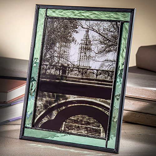 Brighten an area of your living room or office with this simple glass photo frame from J. Devlin Glass Art. It features sage green stained glass and an easel-back, making it versatile for 5" x 7" horizontal or vertical photos. Display it alone or among other fine glass home decorations from Uncharted Visions. All J. Devlin Glass Art is lead-free.