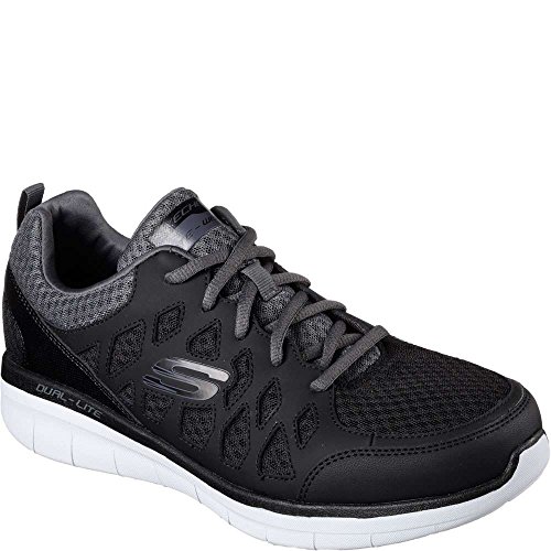 Binding : Apparel Product Description SKECHERS Men's Synergy 2_0 Peslier cross-trainer shoes feature a smooth action leather synthetic and mesh upper. Smooth synthetic overlays for added durability. Lace-up front for a secure fit. Smooth synthetic side and heel overlays. Soft fabric collar and tongue trim. Wraparound synthetic heel panel for added stability. Soft fabric shoe lining. Air Cooled Memory Foam cushioned comfort insole. Shock absorbing Dual-Lite® lightweight midsole for added comfort and range of motion. Rubber traction outsole. 0
