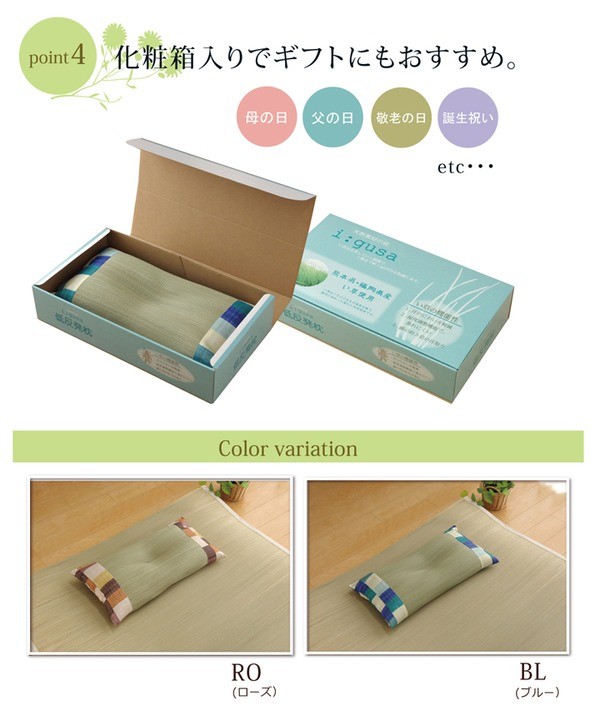 などがあります。国産(九州産)のしなやかなイ草を使用していますので、柔らかく、すべすべとした肌触りです。い草に青森ヒバ加工を施しています(抗菌、防臭効果)。化粧箱入りでお届けしますので、贈り物にもぴったりです。