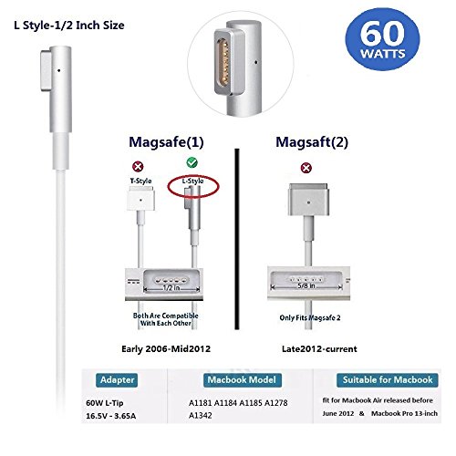 MagSafe Macbook Pro Charger 60W L-Tip Laptop charger 60w power adapter for 13-inch features a magnetic DC connector that ensures your power cable will disconnect if it experiences undue strain and helps prevent fraying or weakening of the cables over time. In addition, the magnetic DC helps guide the plug into the system for a quick and secure connection. When the connection is secure, an LED located at the head of the DC connector will light up; an amber light lets you know that your portable is charging, while a green light tells you that you have a full charge. An AC lead is provided with the adapter for maximum lead length, while the AC wall adapter (also provided) gives users an even easier and more compact way to travel.