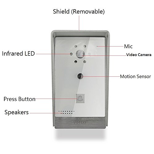 -. Brand : VOTEKI -. Color : White -. Feature : See outdoor and speak with visitors using your smart phone or tablet, when you're upstairs or not home / Human motion detector: when visitors come or people pass by your door,the device will take video automatically and upload to cloud and inform you through your phone,you can check whoever approach your door on cell phone. / Built-in 6 pcs LED for night vision and Wifi mode and support TF card(TF card not include) / 2 mode connect your internet:it can work with WiFi and RJ 45 / Aluminum alloy material case make it more noble and majestic -. Label : KING SON INTERNATIONAL -. Manufacturer : KING SON INTERNATIONAL -. MPN : VOTEKI001 -. PackageQuantity : 20 -. PartNumber : VOTEKI001 -. ProductGroup : Home Improvement -. ProductTypeName : HOME_LIGHTING_ACCESSORY -. Publisher : KING SON INTERNATIONAL -. Size : 155mm*95mm*76mm -. Studio : KING SON INTERNATIONAL -. Title : VOTEKI Aluminum Smart WiFi Doorbell Chime Intercom with Motion Detection Sensor and HD Night Vision Camera Support Apple IOS and Android Smart Phone