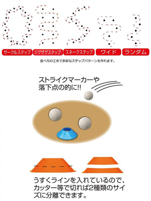 fk094igrjsステップトレーニングの他、ターゲットマーカーなど様々な使い方ができます サイズ 高さ3.5×Φ12.5cm 個装サイズ:16×16×15cm 重量 個装重量:400g 素材・材質 ポリエチレン セット内容 24枚セット(各色8枚入) 製造地域 台湾 様々なトレーニングに使用できる蛍光カラーのステップコーン ステップトレーニングの他、ターゲットマーカーなど様々な使い方ができます