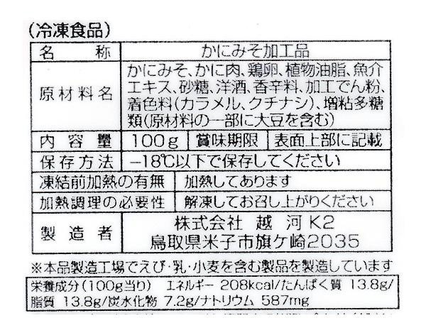 | 原材料 | 名称:かにみそ加工品 かにみそ(韓国又は日本)、かに肉(日本又は韓国)、鶏卵、植物油脂、魚介エキス、砂糖、洋酒、香辛料、加工でん粉、着色料(カラメル、クチナシ)、増粘多糖類(原材料の一部に大豆を含む) ※かにみそ、かに肉の産地は、平成29年4月から同年10月までの使用実績順 ※かにみそ、かに肉の産地は時期により変わります。 |
