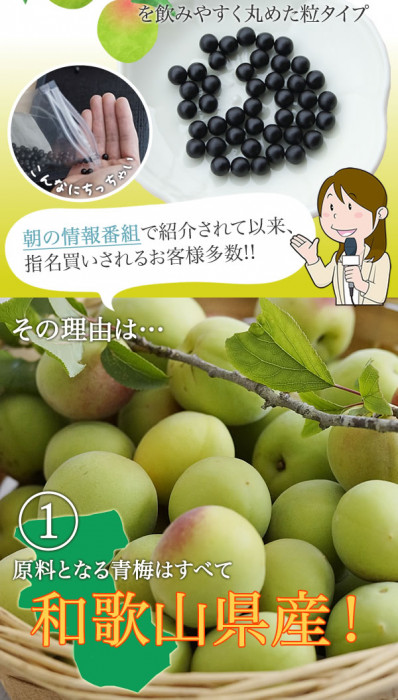 | 原材料 | 名称:梅肉エキス 梅エキス、カンショ、でん粉、食物繊維、カキ殻末 |