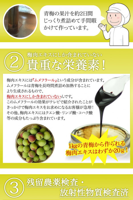 | 梅肉エキスをそのまま飲むのはちょっと苦手…そんな方にオススメなのが粒タイプ。梅肉エキスにしか含まれていない「ムメフラール」ももちろん豊富に含まれています!1日5~10粒を目安に、是非毎日の健康管理にお役立てください。 |
