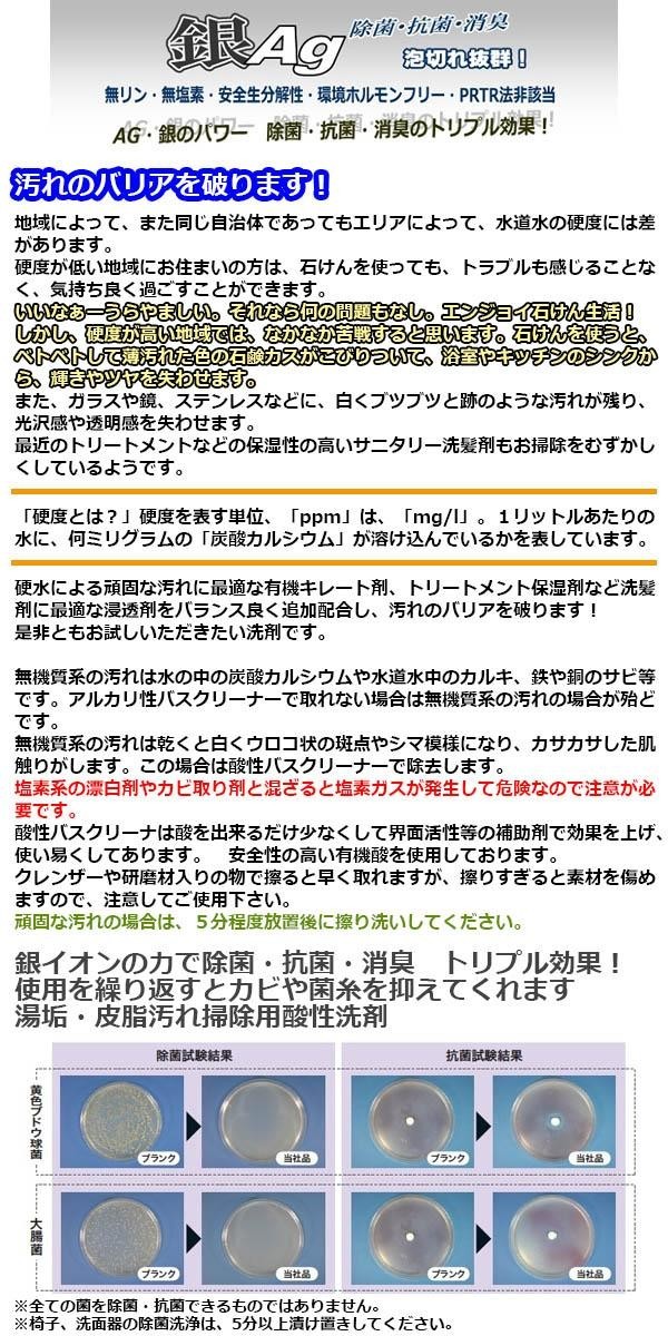 銀イオンの力で除菌・抗菌・消臭洗浄し、Wの酸で強力洗浄。嫌な刺激臭がなく、お掃除直後スグにでも入浴できる安全な石鹸カス・スケール掃除用酸性洗剤です。 |