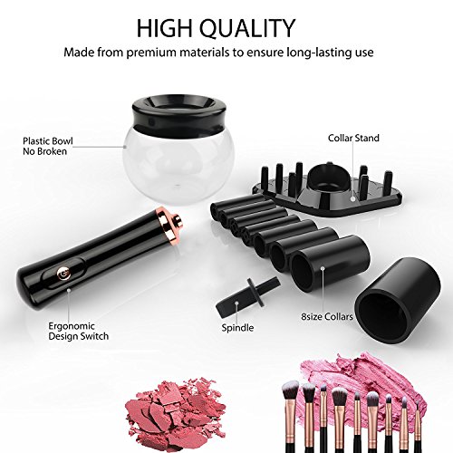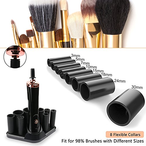 - 【Applicable for Cleaning & Drying Most Brushes】The makeup cleaner comes with 8 flexible rubber collars in different diameters(Size: 3mm,5mm,7mm,10mm,15mm,18mm,24mm,30mm). This brush cleaner electric is applicable for deep cleaning and drying all sizes makeup brushes in the market and different types of brushes such as eye brushes and foundation brushes.