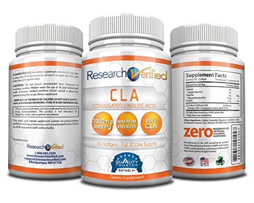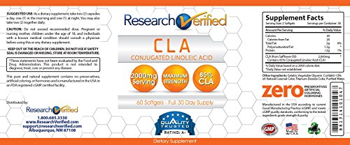 RESEARCH VERIFIED MEETS CRITERIA OF CLINICAL STUDIES AND DR OZ - Research Verified CLA contains the same properties and formulation used in the clinical study and recommended by Dr. Oz: Each capsule of Research Verified CLA contains 85% Standardized Conjugated Linoleic Acid; no fillers, binders or any other extra ingredients; serving size of 2000mg per day (1000mg capsule, 2x per day); 100% pure.Feature