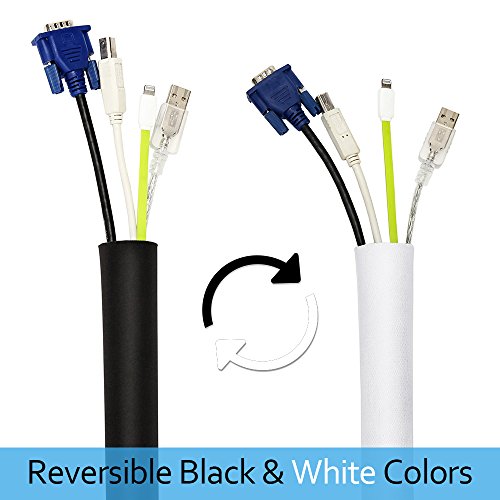 Cable management sleeve: reversible black & white colors, 100''long, 5.3''width, 1.5''in diameter when wrapped up. It will keep your office and home neat & tidy with no more messy cables