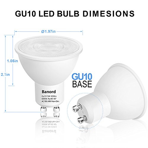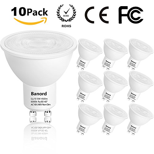 Banord GU10 LED Light Bulbs 10 pack, 5W(50W Halogen Bulb Equivalent),6000K(Daylight White),450 lm 40° Home LED lights bulbs for Appliances,Kitchen,Outdoors,Office, Restaurants, and Stores
