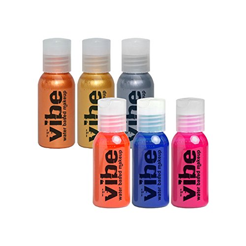 EBA VIBE FLUORO METALLIC 6-PACK Vibe Standard colors consist of primary and secondary colors including UV responsive, metallic and glamour colors.?The Vibe water based airbrush makeup is the cornerstone for face, body art and body painting applications. It is highly pigmented, smudge and transfer resistant, moisture resistant, instantly dry and it can be washed off with soap and water. Vibe is completely water based without any alcohol making it a superb alternative over common hybrid makeups containing solvents. Most importantly as low as 7psi is needed for application making Vibe the most "application friendly" and demanded airbrush water based makeup available on the market. VIBE STANDARD APPLICATION: - Face Art