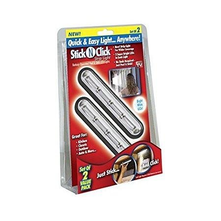 Now there is Stick N Click Strip lights, the battery operated LED peel and stick strip lights that you peel then stick and click for instant light anywhere. No tools, no dangerous wires and no complicated installation. Just Peel, Stick and Click for quick easy light anywhere. Use stick and click to lighten up all your dark spaces. Enjoy bright white light wherever you need it fast, easy and without tools. Stick N Click Strip Lights are compact yet powerful LED lights install in seconds just about anywhere you need light. Just Peel, Stick and press to turn on and off, it's that easy. Also great for closets, storage rooms, crawl spaces, tool boxes, boats, trunks, bicycles, hiking, and so much more. Each set comes with 2 Stick N Click Wireless LED Strup light. Each light requires 3 "AAA" batteries. Not included.Feature