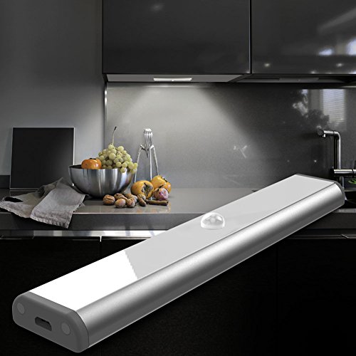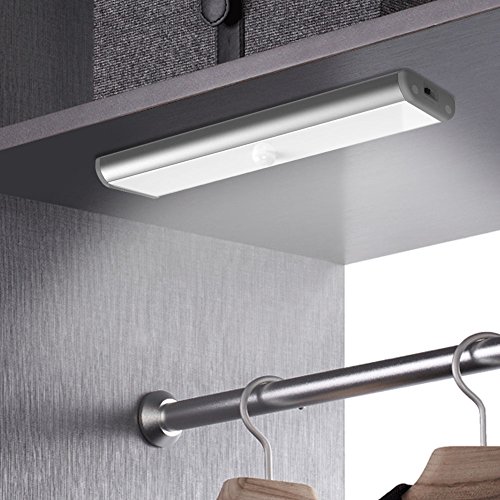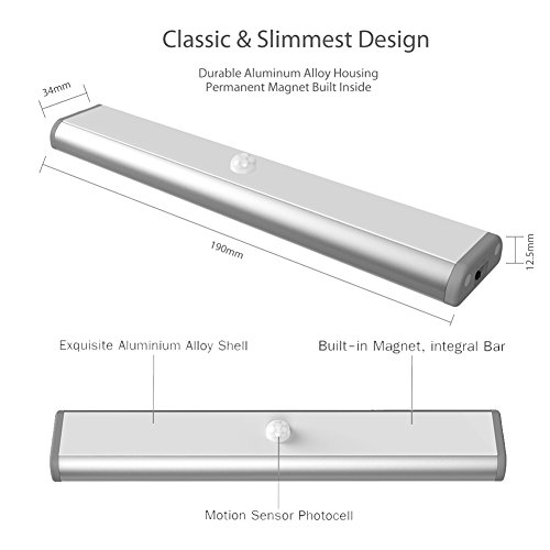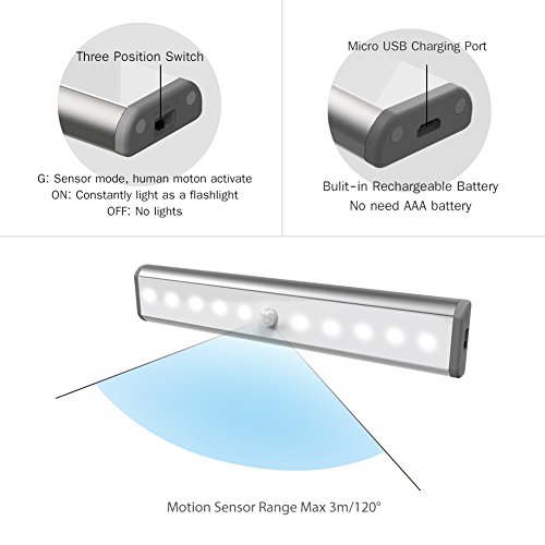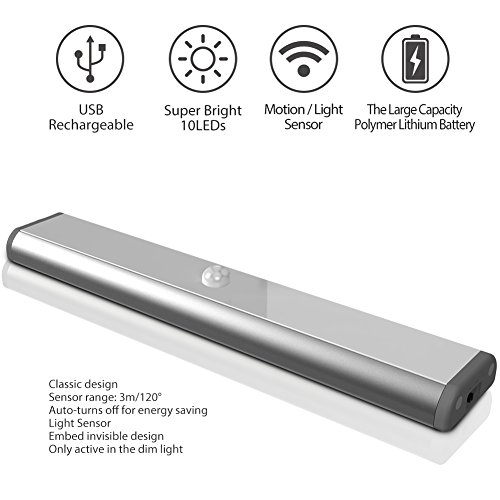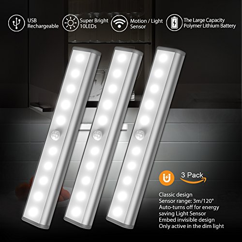 Motion Sensor Cabinet Led Light, USB Rechargeable 3 Modes Switch(G,ON and OFF) Magnetic Stick On Anywhere Outdoor Portable Night Light Lamp Bulb Lighting Bar for Closet Wardrobe (3 Pack 10LED, Silver)