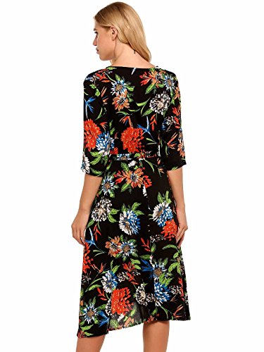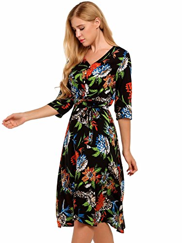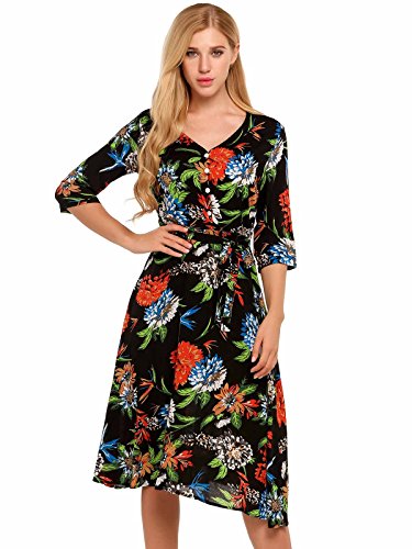 ANGVNS Women's Casual V-Neck 3/6 Sleeves Floral and Leaves Print Dress