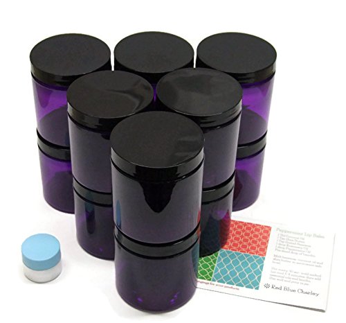 Made in USA. This 12 pack includes 1 white .25 oz mini jar, blue lid and 1 cosmetic recipe card from Red Blue Charley