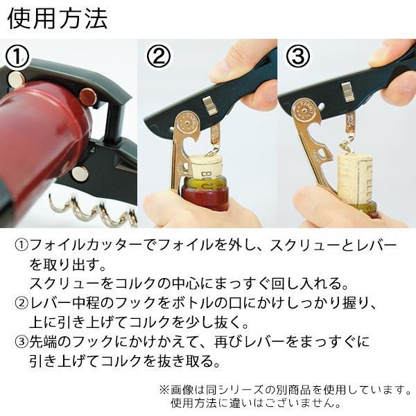 ダブルアクションレバーで、コルクがまっすぐ簡単に抜けます。90度回転させるだけでフォイルが簡単に切れる4つ刃のフォイルカッター付きです。シンプルで使い易い定番アイテムです☆ |