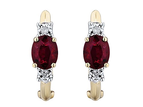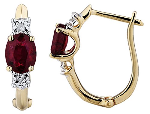 Beautiful Lab Created Ruby and Diamond Hoop Earrings. These lovely earrings feature a 5x4 MM Oval Shape Created Ruby with two round white diamond accents. The Diamonds are HI Color, I2-I3 Color. The setting is 10k Yellow Gold. Prongs for the diamonds are White Rhodium Plated. The earring back is a hinged post. These earrings are quite lovely - they are small, more of a huggie style. Earrings are approximately 5/8 inch long x 1/2 inch wide. They are perfect to wear for any occasion. They are also available with Created Blue Sapphires. We recommend cleaning with mild soapy water and buffing gently with a soft cloth.Feature