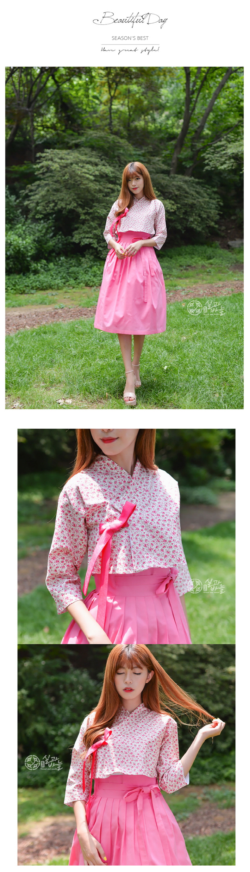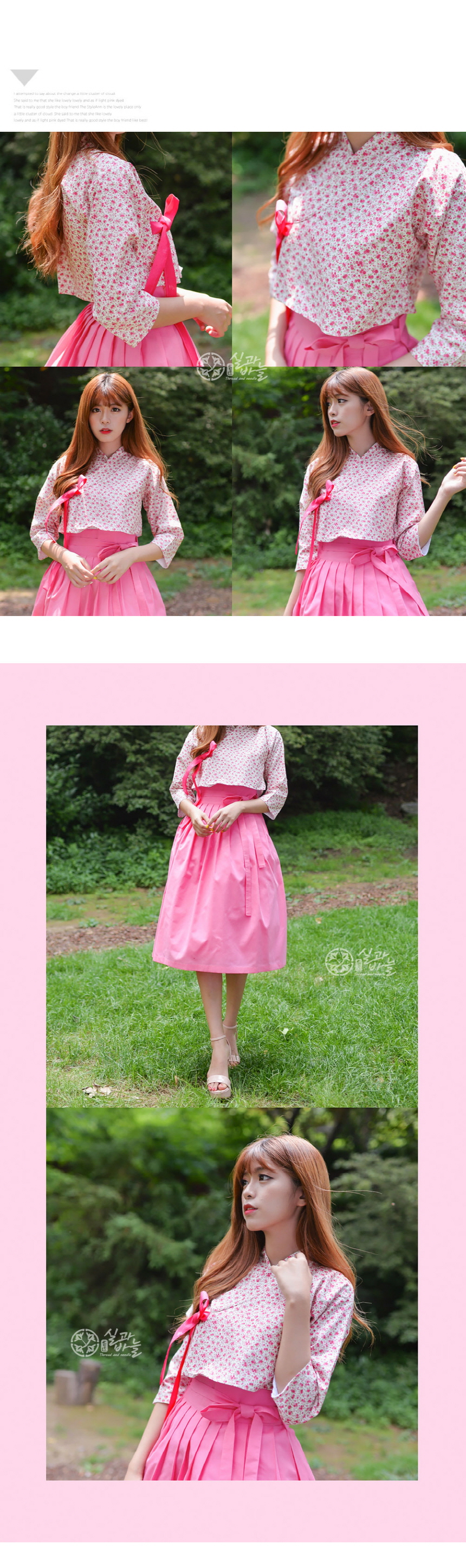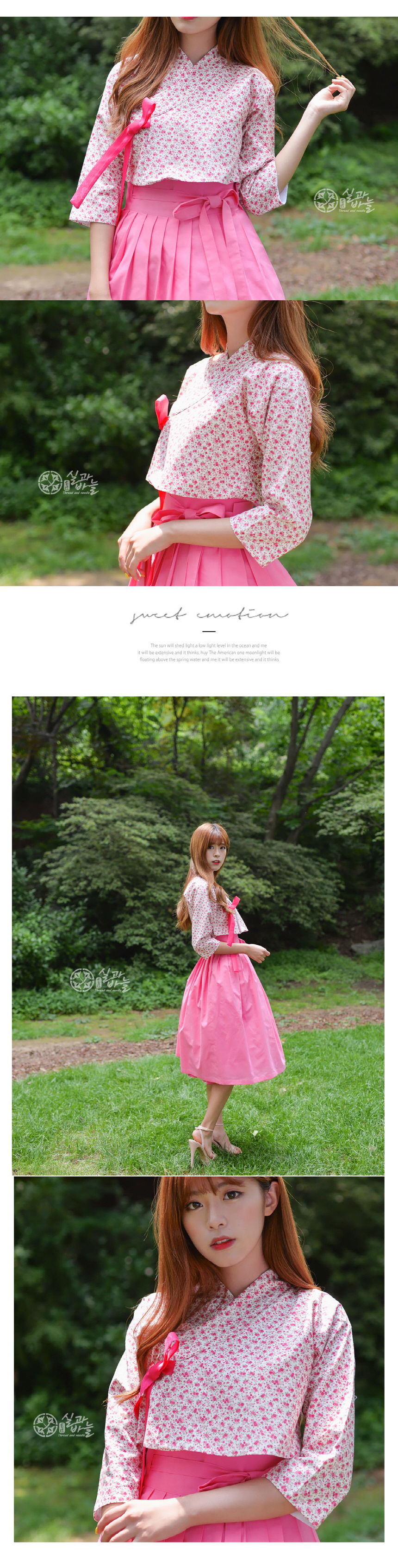 -도트플라워 핑크 저고리의 고름은 한복지 원단으로 제작되어 포인트를 주었고, 한복의 느낌을 살렸습니다.