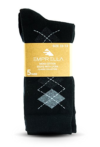 -. Binding : Apparel -. Brand : Emprella -. Department : mens -. Feature : STAND OUT FROM THE CROWD: Break the iron grip of boring mens dress-wear! Tired of only wearing black dress socks? The color brown have you down? Add some variety to your dresser drawer with awesome, argyle mix, Draw some attention with fun, happy, color-ful, crazy, cool and funky patterns that no one in the office can match with our 12-pair multi-packs! Our crew length (mid calf) dress socks are designed to fit US shoe sizes 8-13 for men / A PERFECT GIFT IDEA FOR GUYS: Whether giving from father to son or vice versa, These dress socks make great birthday gifts & Christmas or holiday stocking stuffers for the best men in your life. We've even had many grooms use them as wedding party or groomsmen gifts. With bold and bright purple, green, blue, red, navy, black, light and dark grey, yellow, orange and white patterns, they surely add a pop of color with casual khakis or dress pants, a suit & tie or a formal tuxedo! / Comfortable Lycra & Breathable Cotton Blend / Fits Shoes Sizes 6-12 (Sock Size 10-13) -. IsAdultProduct : 0 -. ProductGroup : Apparel -. ProductTypeName : SOCKSHOSIERY -. Title : Mens Dress Socks 5 Pack Cotton Argyle Dress Socks Assorted Colors -5 Pair