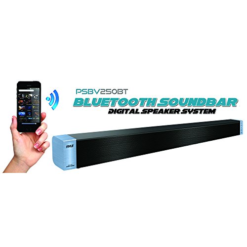 The Pyle Audio Level Bluetooth Stereo Sound Bar Speaker System is what your entertainment system has been missing. Built-in Bluetooth technology allows you to wirelessly stream audio from your favorite devices (works with virtually all Bluetooth-enabled devices likes iPhone, Android, Smartphone, iPad, Tablet, PC, etc.). Connect the 2-channel sound bar to your home theater system or computer thanks to the RCA Aux input. Add rich, full-bodied audio to any room in the house quickly and easily. It connects to your DVD player, cable box, TV or any other audio source -- connect it all! It works with additional external devices, like a Smartphone or MP3 Player, thanks to the AUX (3.5mm) input connector jack. The system also includes full function remote control so you can control it all from the couch. Let Pyle improve your home audio experience and add the PSBV250BT Bluetooth Sound Bar to your entertainment system.Feature