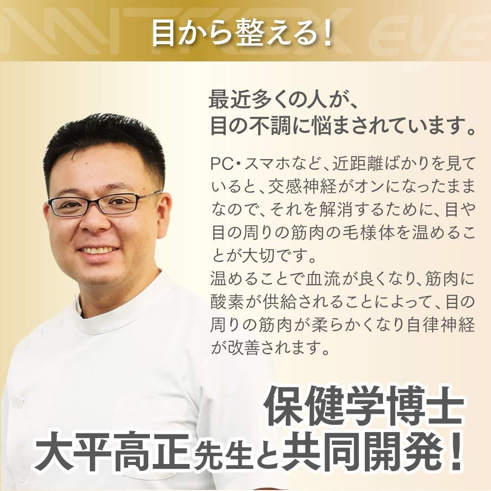 【保健学博士大平先生考案】人間工学に基づき設計、疲れた目と目の周りの筋肉をじんわり奥からほぐします。保健学博士大平先生と MYTREX ブランド 共同開発の ホット アイマスク 。目や目の周りの筋肉を 温める ことで目の周りの筋肉が柔らかくなり、目の疲れ 眼精疲労 目のクマ 目のかすみ の改善が期待できます。