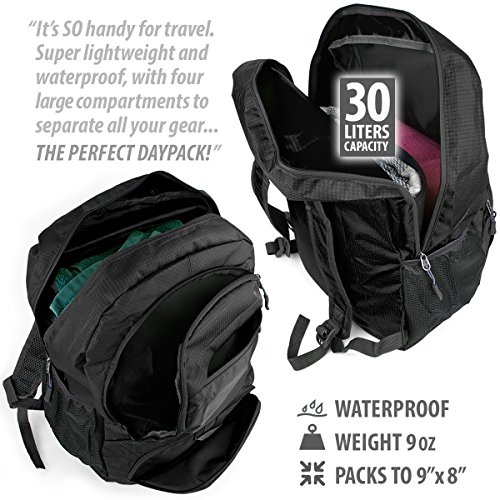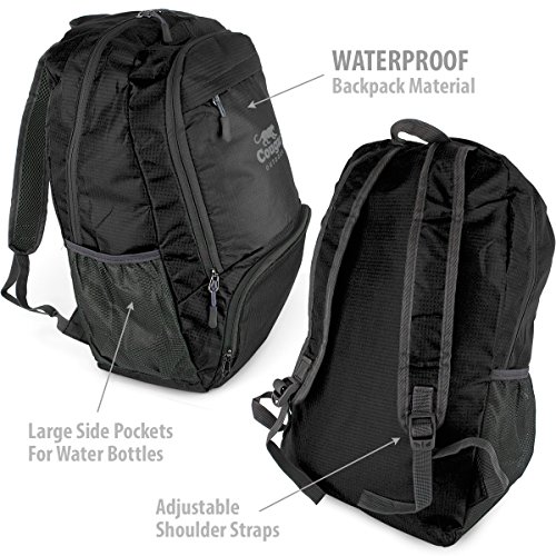 -. Feature : QUALITY ASSURED - Our foldable backpack is made from durable highly rip and waterproof nylon fabric with abrasion resistant SBS metal zippers. / PRACTICAL IN DESIGN - Featuring a roomy main compartment with 30 liters of storage space, 2 zipped pockets for holding your accessories securely and 2 handy easy access water bottle holders. / CONVENIENT - This Lightweight foldable travel backpack is the perfect companion for day trips, vacations, travel, day hikes, school, camping and shopping. With fold down pouch dimensions of 9x8x1.5 inches it can be taken anywhere. / COMFORTABLE - With breathable and adjustable shoulder straps to ensure the backpack is ready for all day use without giving you sore shoulders. / A MUST HAVE - Makes a superb gift for anyone who wants a travel backpack or just a backpack for day to day use. Have peace of mind with our 2 year warranty.