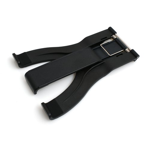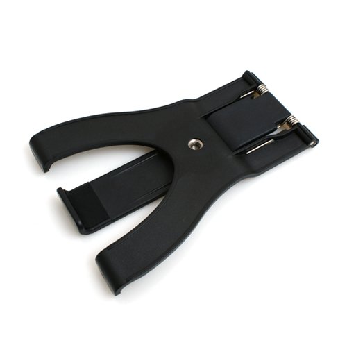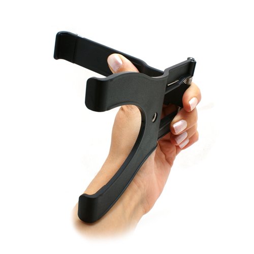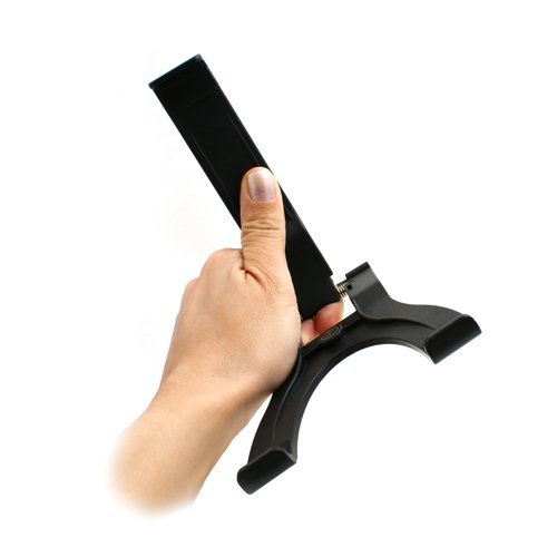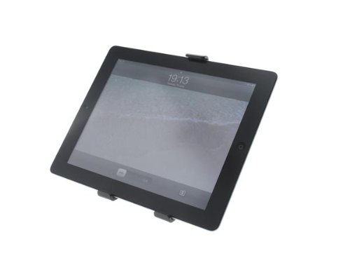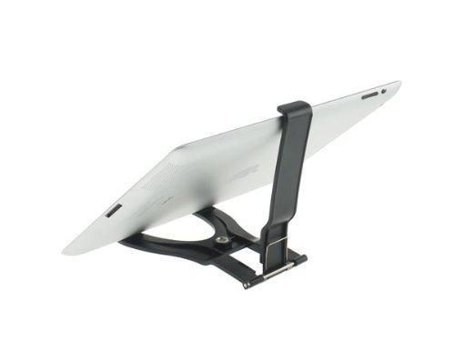 With this adjustable mount, you can affix your iPhone, smartphone or tablet to tripods with 3/8 screw thread. The mounting device is folding and fix items by tension spring mechanism within 5 to 21 cm range (e.g. iPad mini, iPad 4, Samsung Galaxy Tab).  With the appropriate tripod, you can use your tablet as desktop with both hands free to operate.