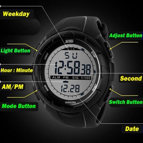 -. Feature : Brand new, fashion military digital design / Displays Hour, Minute, Second, Day, Date and Month / Multifunction: alarm, stopwatch and EL backlight / Equipped with adjustable buckle design / 3 ATM water resistance for convenience in your daily life