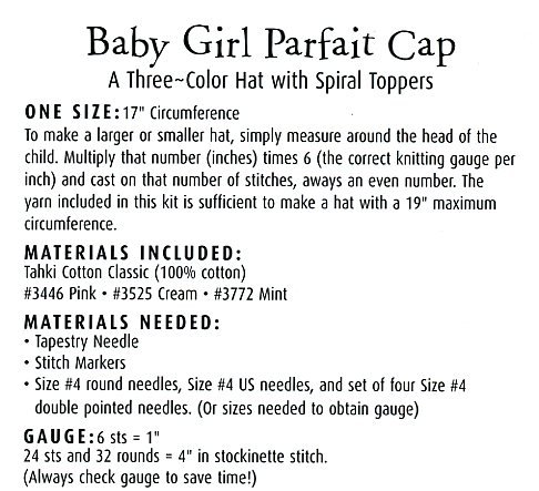 -. Binding : Baby Product -. Color : Multicolor -. EAN : 0614458973856 -. Feature : Design by Debby Ware / Sizes: Infant sizes: newborn to 1 yr / Needles Required: US 4 16", US 4 dpn / Yarn Sested: Tahki Cotton Classic / This is for the pattern only and does not include yarn, other supplies or a finished product -. Label : Debby Ware -. Manufacturer : Debby Ware -. PackageQuantity : 1 -. ProductGroup : Baby Product -. ProductTypeName : BABY_PRODUCT -. Publisher : Debby Ware -. Studio : Debby Ware -. Title : Baby Girl Parfait Cap - Debby Ware Knitting Pattern -. UPC : 614458973856
