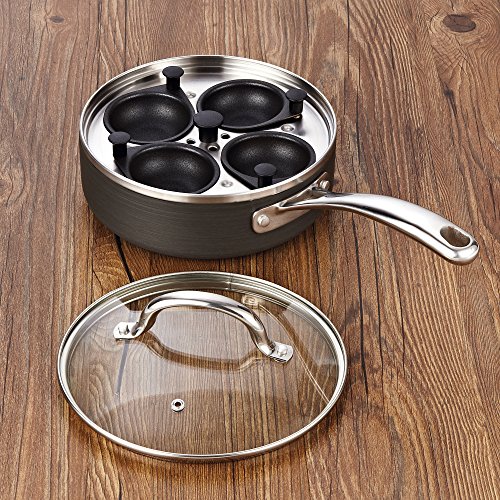 The Cooks Standard 4 Cup Nonstick Hard Anodized Egg Poacher Pan with Lid, 8-Inch has an anodized surface that is durable, heats evenly, and prevents hot spots. Nonstick makes food release/cleaning easy and allows for healthy cooking. 4 cups are made of hard anodized aluminum and hold 60 ml each. Tempered glass lid with steam vent makes viewing food easy. Stainless steel handle is riveted for strength and stays cool. To use: fill pan with water, put eggs in cups, and cook to desired firmness. Not Induction compatible. Works on: gas, electric, glass, halogen, ceramic, etc. Oven safe to 350F. Dishwasher safe.Feature