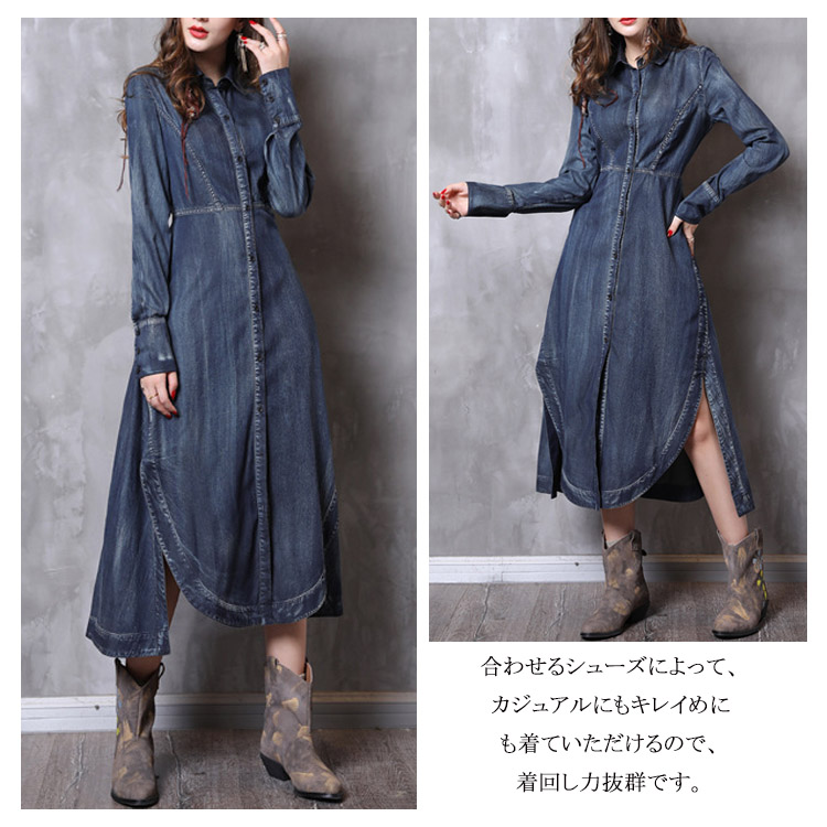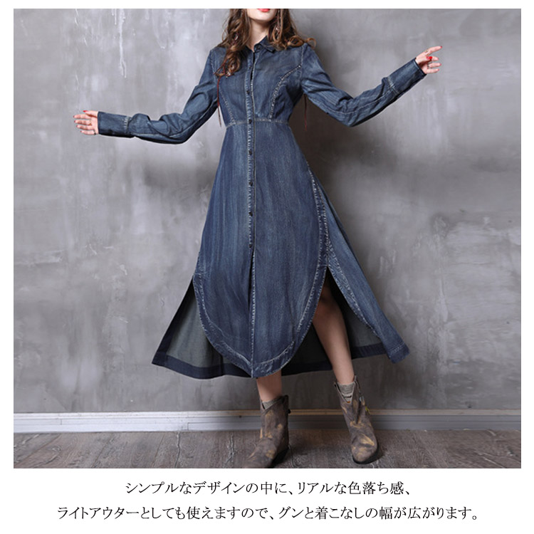 | 大人のカジュアルスタイルをおしゃれに引き立ててくれる、デニムシャツワンピースです。シンプルなデザインの中に、リアルな色落ち感、ライトアウターとしても使えますので、グンと着こなしの幅が広がります。合わせるシューズによって、カジュアルにもキレイめにも着ていただけるので、着回し力抜群です。これからの季節におすすめです。 | |