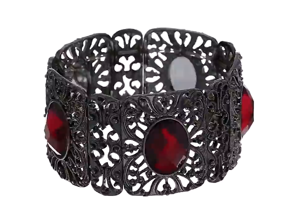 A lovely accessory with a pop of color. Featuring black-tone filigree panels with oval red faceted stone accents all around. A beautiful piece to accessorize any outfit.