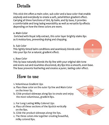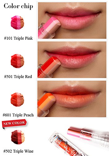 -. Feature : A triple-colored lip tint that creates / petal-bitten gradient effect with a single touch. / Apply a moderate amount according to lips line gently. / #101 Triple Pink #501 Triple Red #601 Triple Peach