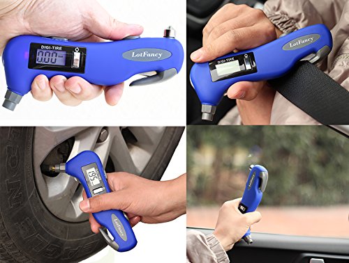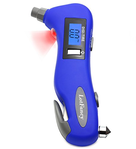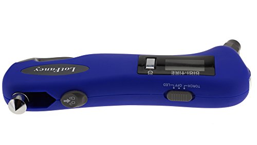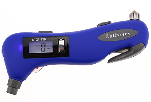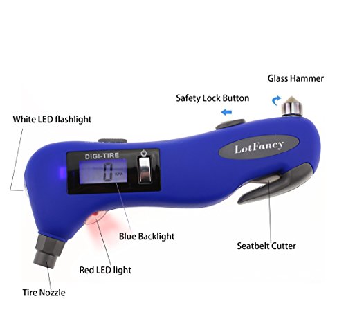 Studio : LotFancy Publisher : LotFancy Product Description Car Safety Tool! You thought this is just a tire gauge? - Well, you were wrong! This awesome device and be used as a: - Seatbelt Cutter - Window Glass Breaker - Flashlight - Red LED Light Short Description: A multifunctional device that needs to be in every car, this tire gauge can help you in any case of emergency, you can cut your seatbelt, break your windows or use it as a flashlight! Backlight display to be able to measure tire pressure under dim and dark conditions How To Use: Press "on" to boot, it will automatically display "0". Align the gas nozzle of digital tire gauge with a automobile tire valve and push, you need to remove the tire valve cap first and make sure it does not leak, maintain until there is a stable measurement value before you release. The measured value will remain about 90 seconds,then the display turns off automatically. Press and hold down the " on " button for 3 seconds to force a shutdown. Other Specifications: Recommend usage environment temperature : 30-122 Fahrenheit Measure range 5-150 PSI, accurate: ± 1 PSI (5-99 PSI), ± 1.5 PSI (100-150 PSI) Power: 1X CR2032 cell battery (included, for tire gauge function) 1X AAA battery (NOT included, for backlight, LED light and flashlight) Package Includes 1 x Tire Pressure Gauge 0