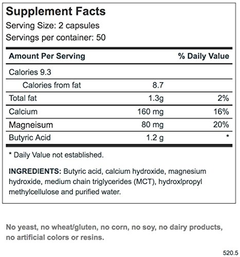 Butyrate is a short chain fatty acid (SCFA) that has been combined with calcium and magnesium. It is made in the lower colon by bacteria and taken up by the colonocytes, the cells that line the colon. It then becomes an important food for those cells. Lacking good bacteria in our colon, such as when we take antibiotics, can lead to an insufficient supply of butyrate.