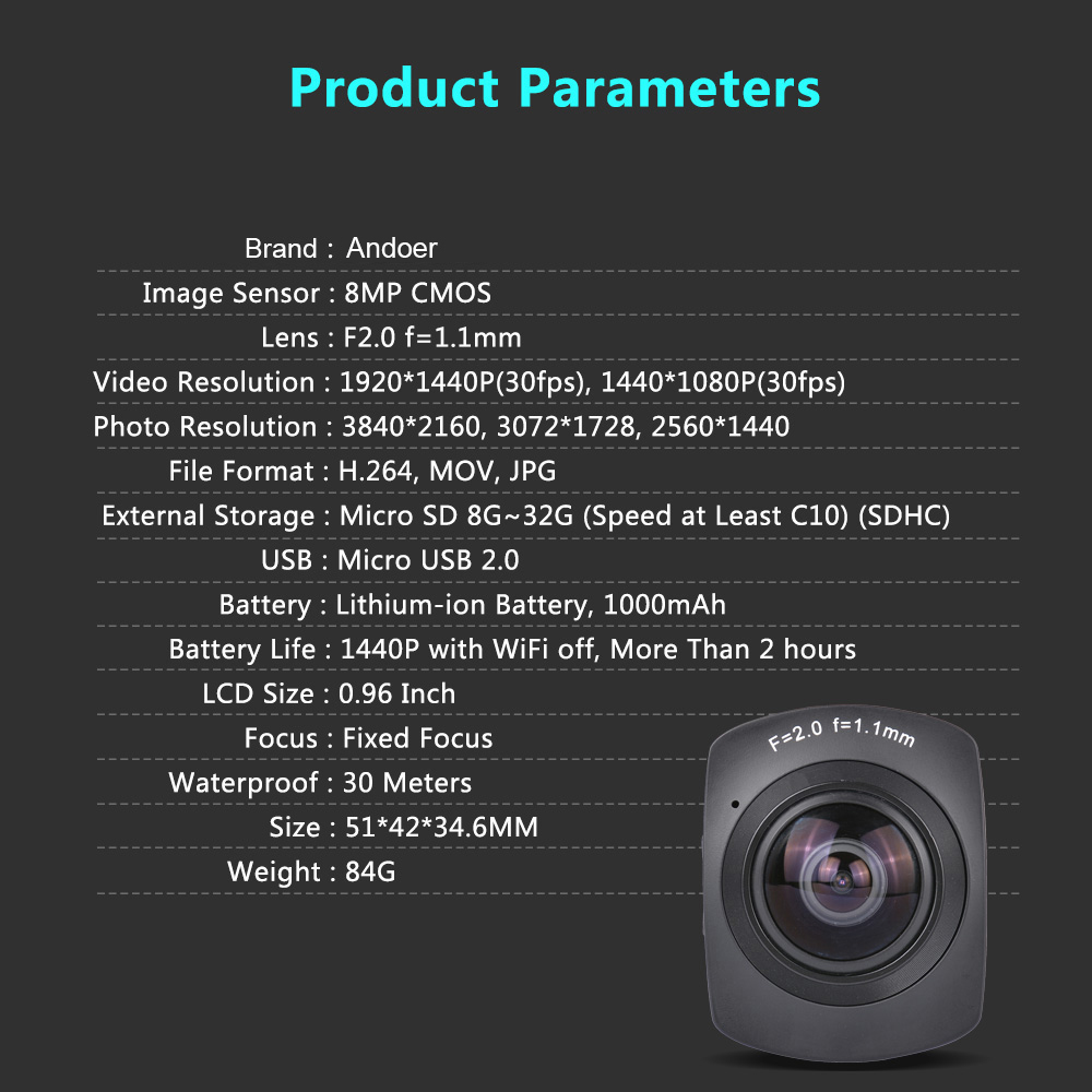 3840*2160.--Virtual Reality System, Support with Gyroscope.--Support VR, tile horizontal, hemisphere display, video split-screen display and Up-down flip.--Connect camera to a HDTV with for High Definition Multimedia Interface cable and display signals will be output to HDTV.Bulit-in Speaker, interface