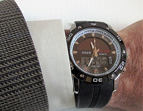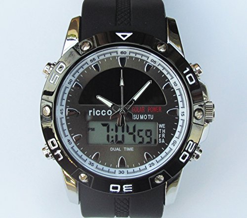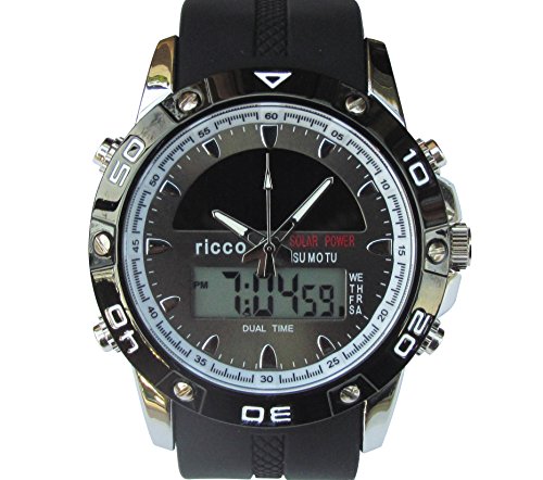 -. Feature : LARGE EASY TO READ WITH BACK LIGHTING This solar powered watch by ricco power has a large, easy to read dial with back lit digital settings. / ACCURATE & RELIABLE. With the precise Japanese movement and dual time settings you will accurately know the time where ever you are. Plus the second setting can be set to your favorite vacation spot, another part of the country, or any part of the world. Easy to follow, English, instructions. / AUTOMATIC DATE SETTINGS. The day, date, month automatically changes to the new month without having to adjust for longer or shorter months. / CUSTOM length "ricco" comfortable silicone band.